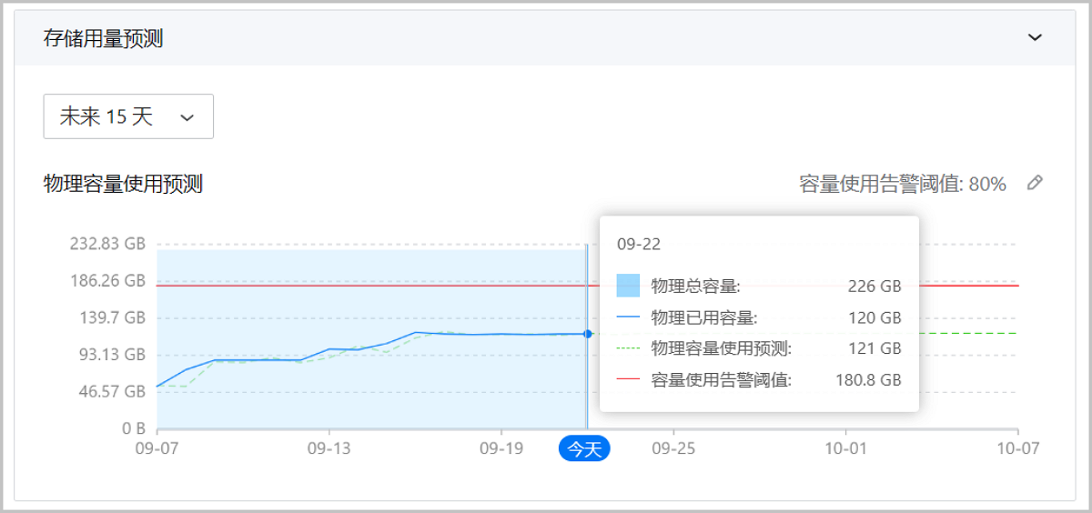 ZStack Cloud 4.7.21新增存储用量预测卡片,支持根据主存储容量使用情况动态预测未来180天的物理容量使用趋势。通过存储用量预测卡片,用户可查看主存储主存储物理总容量、物理已用容量、物理容量使用预测曲线和容量使用告警阈值。