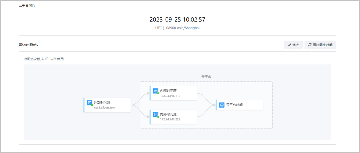 云平台实时展示最新的平台时间,配置时间源后,该时间会自动与时间源同步。若系统时间与时间源时间存在较大偏差,可通过强制同步快速调整,避免逐步调整耗费较长时间。