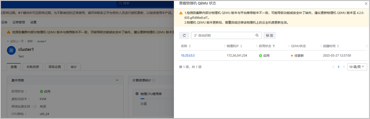 ZStack Cloud 4.6.21开始,集群详情页新增QEMU版本异常提醒。当集群内存在物理机QEMU版本与平台推荐版本不一致时,详情页将出现提示信息,建议用户查看并更新物理机QEMU版本,及时规避QEMU版本异常造成的安全或功能使用问题。