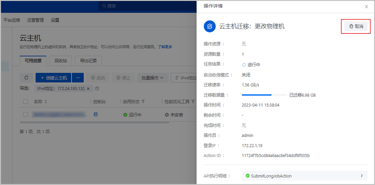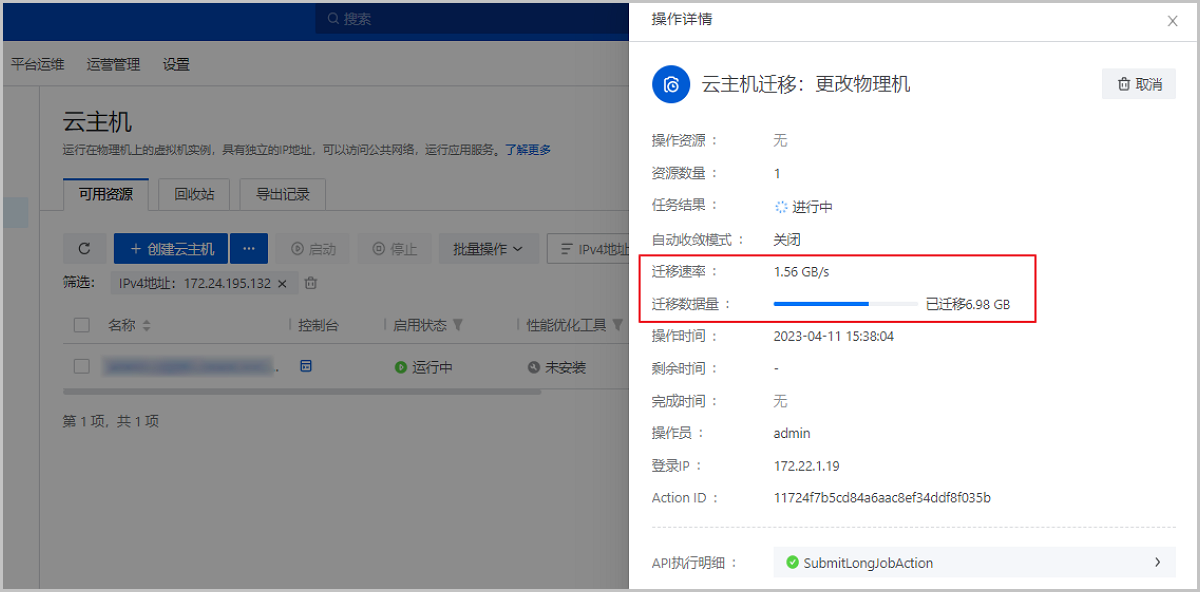 ZStack Cloud 4.6.21开始,云主机热迁移 (在线更改物理机、在线更改主存储、在线更改物理机和主存储) 时,新增支持动态展示热迁移的实时速率和迁移数据量。