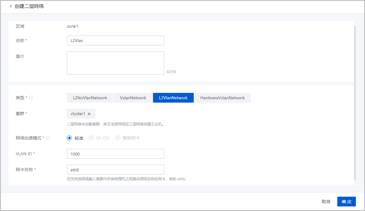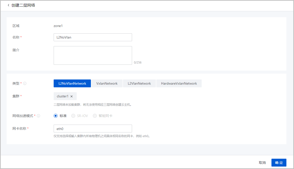 ethx格式的网卡名称会在系统重启后导致网卡顺序随机改变,尤其是带多网卡的云主机环境中,建议将各计算节点的网卡设备名称修改成非ethx格式,例如:可修改成em01格式。在ZStack Cloud主菜单,点击,进入二层网络界面。点击创建二层网络,弹出创建二层网络界面。