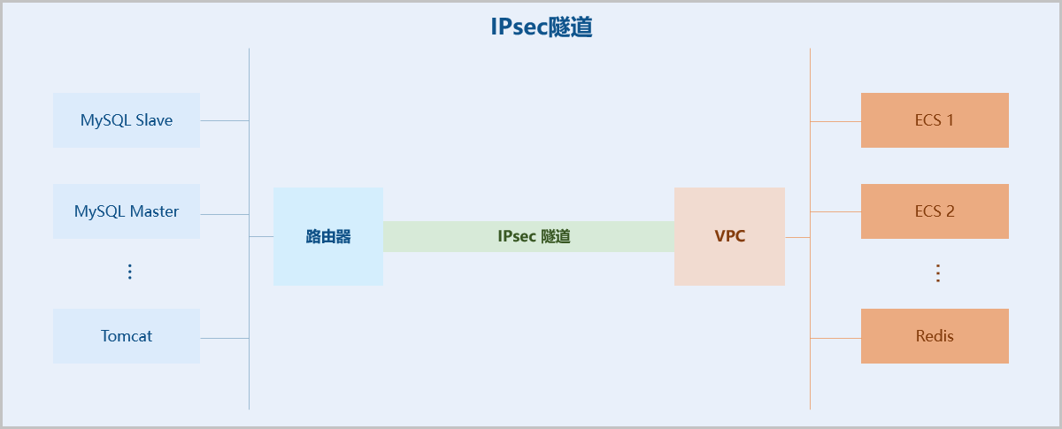 • VPN连接:VPN网关和VPN用户网关建立连接后的加密VPN通道,实现本地数据中心的私有网络与阿里云端VPN网络进行通信。