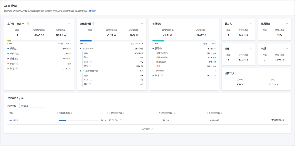 • 上方版块:以卡片形式展示各种核心资源详细容量信息,包括:主存储、镜像服务器、管理节点、云主机、数据云盘、镜像、快照、计算节点。