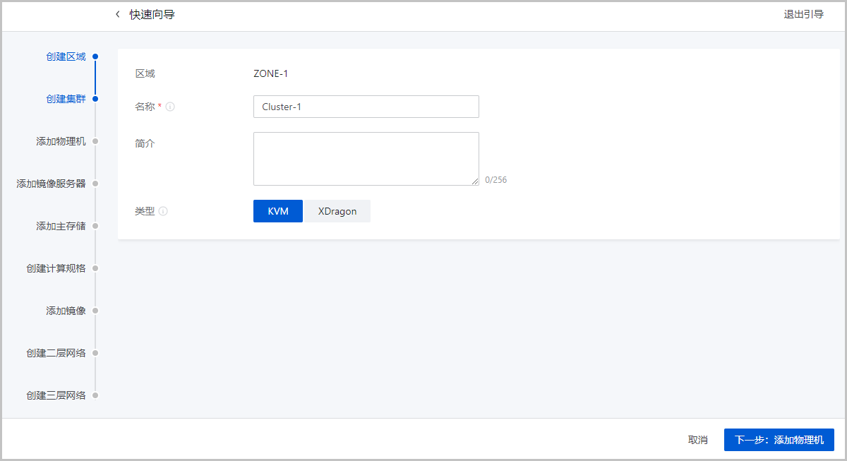 • 类型:可选择服务器的 Hypervisor 类型,包括:KVM、XDragon