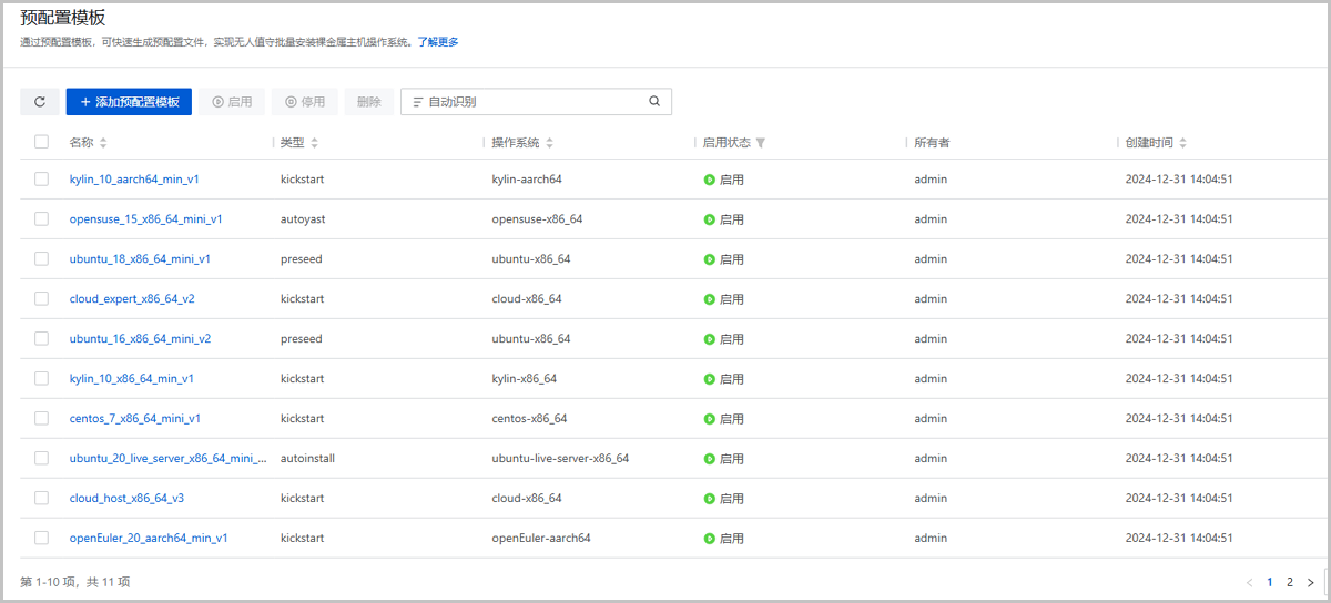 自定义模板:支持上传自定义模板文件,采用UTF8编码格式,除了包含基础的系统变量,可按需自定义变量,适用于复杂的无人值守部署场景。