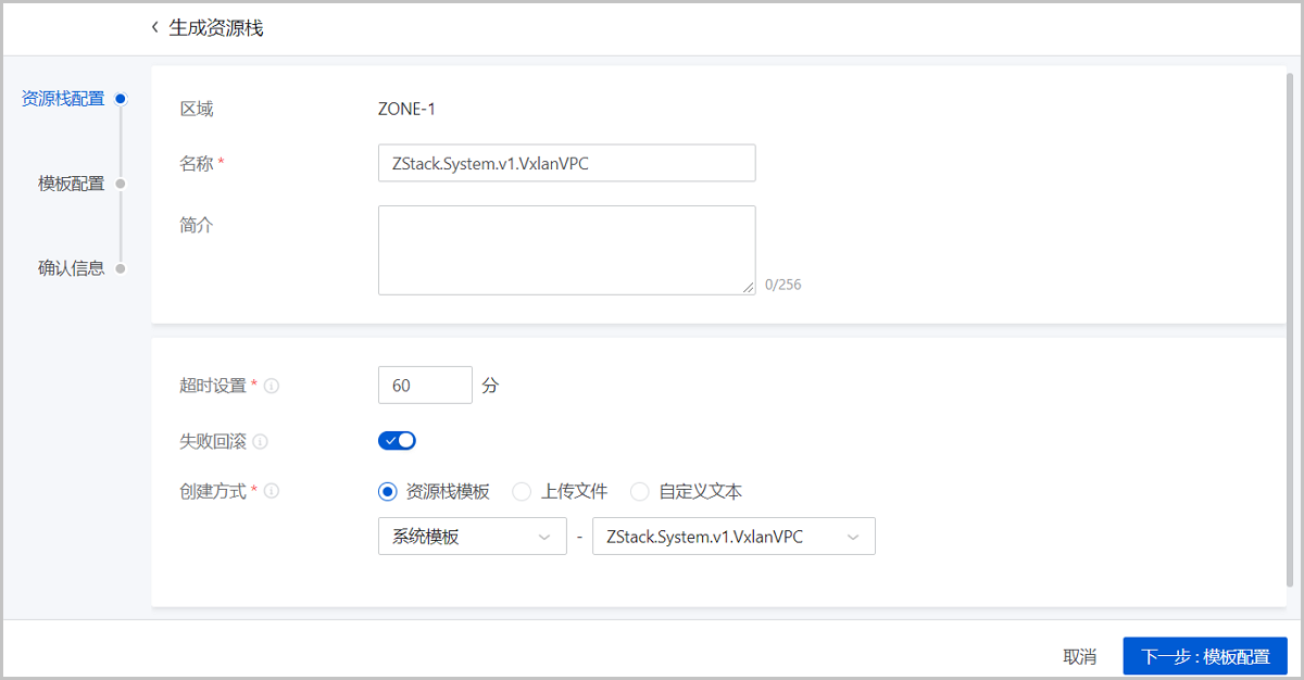 说明: 如何创建自定义模板,请参考资源栈模板章节。
