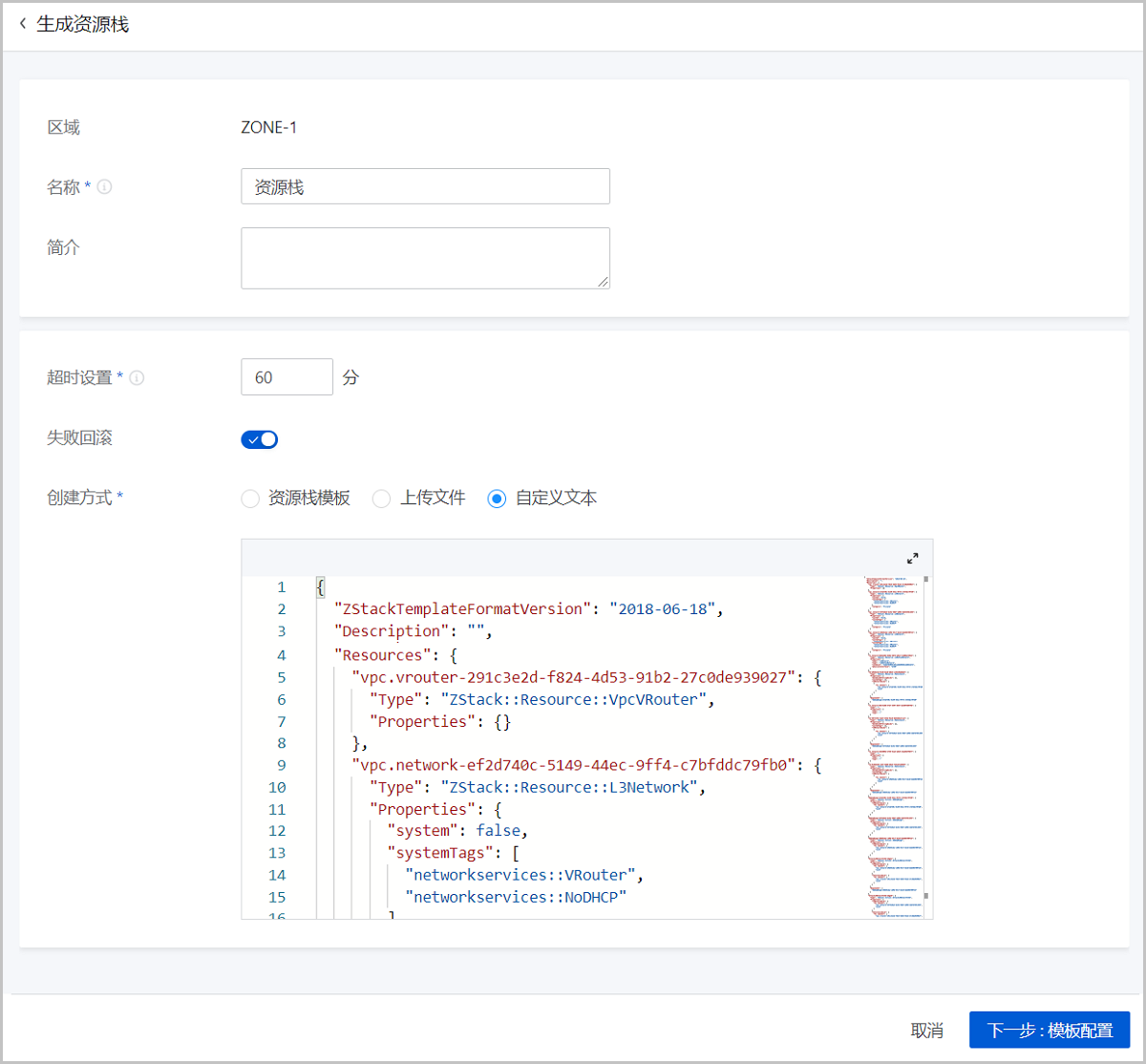 • 自定义文本:在文件编辑器中编辑模板创建资源栈