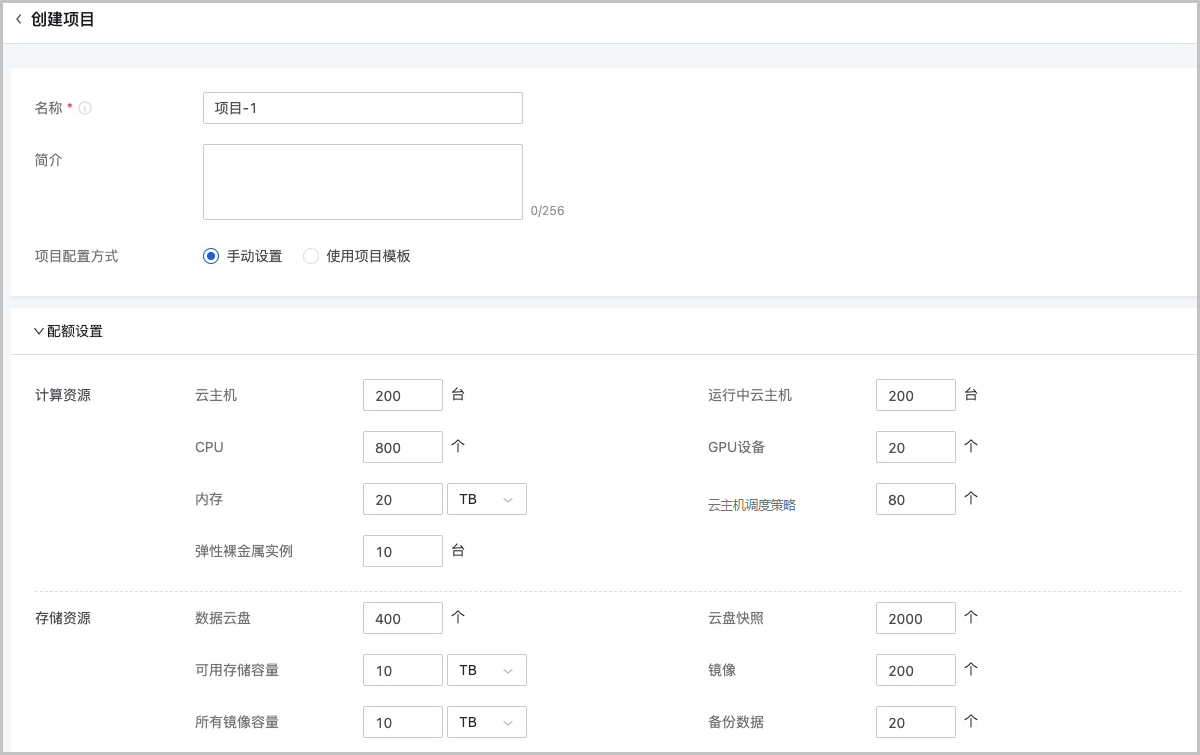 • 计算资源:包括云主机数量、运行中云主机数量、CPU数量、GPU设备数量、内存、云主机调度策略数量、弹性裸金属实例的配额设置