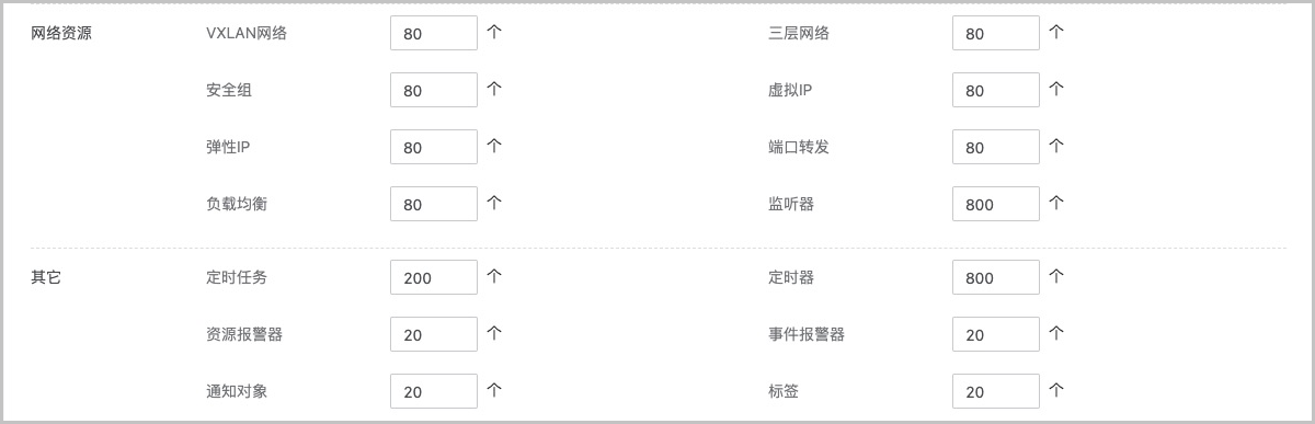 • 其他:包括定时任务数量、定时器数量、资源报警器、事件报警器、通知对象、标签的配额设置