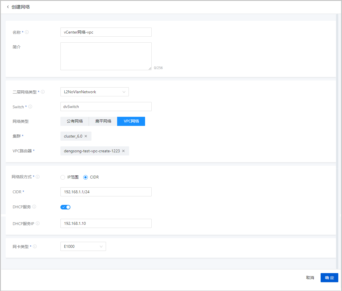 | 添加网络段 | 给vCenter网络添加网络段。IPv4 类型的公有网络支持地址池功能,可同时添加普通网段和地址池网段。扁平网络和VPC网络仅支持普通网段。 |