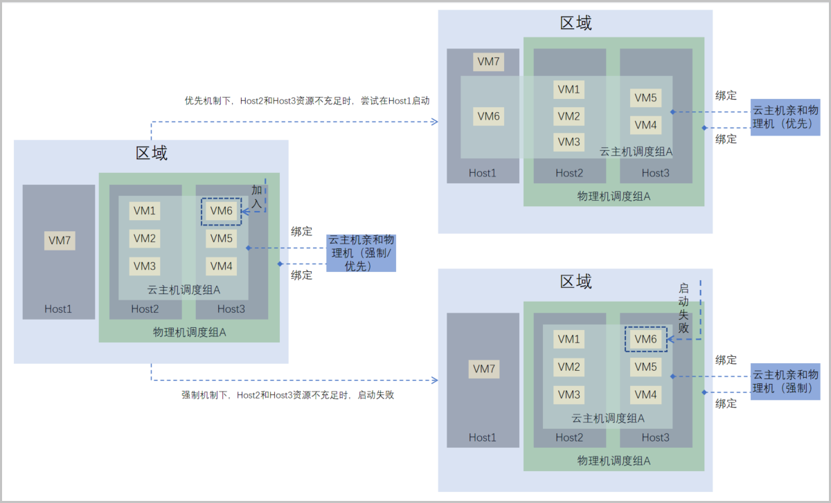 场景4:假定区域内有三台物理机Host1、Host2、和Host3。云主机调度组A已绑定云主机亲和物理机调度策略,且云主机VM1~VM5已加入该调度组,并分别运行在物理机Host2和Host3上。物理机调度组A也已绑定云主机亲和物理机调度策略,且物理机Host2和Host3上已加入该调度组。此时将云主机VM6加入云主机调度组A,不同执行机制下云主机VM6行为如下: