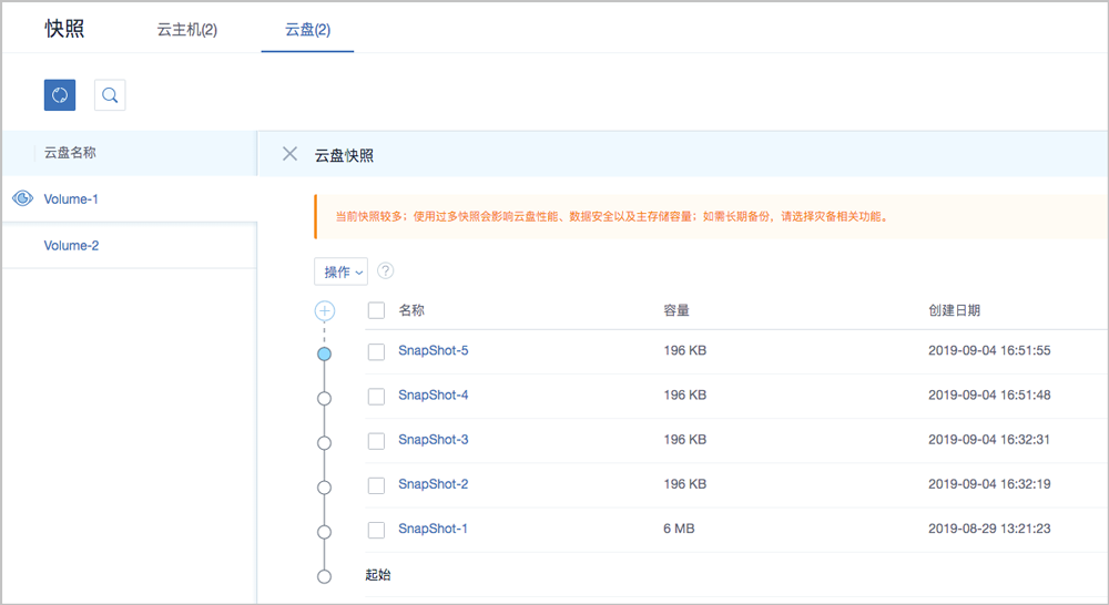 在生产环境中,建议单块磁盘的快照数量尽量控制在5以内,快照过多会影响云主机/云盘的IO性能、数据安全以及主存储容量。不建议进行高频的定时快照备份。如需长期备份,请选择灾备相关功能。