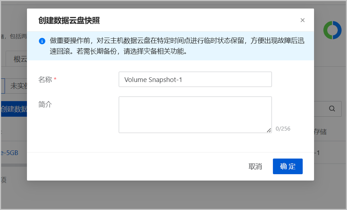 在ZStack Cloud主菜单,点击,进入数据云盘界面。选择某一云盘,点击,弹出创建数据云盘快照界面。