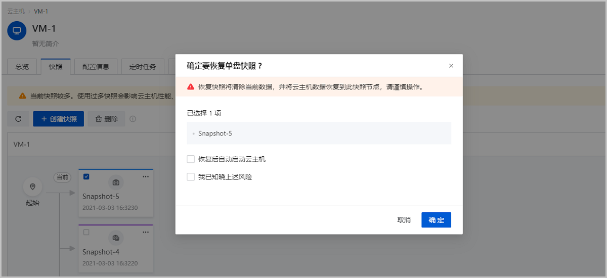 在ZStack Cloud主菜单,点击,进入云主机界面。选择某一云主机(已停止),在云主机详情页的快照子页面,选择某一单盘快照,点击恢复,弹出恢复快照确认框。