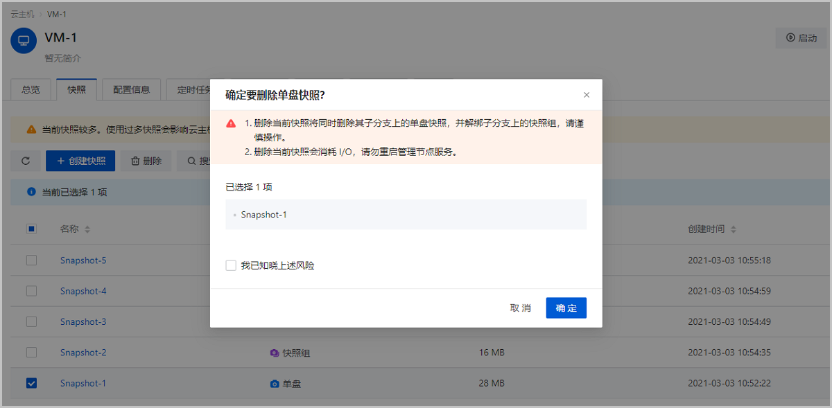 以删除某一云主机单盘快照为例,在ZStack Cloud主菜单,点击,进入云主机界面,选择某一云主机(运行中/已暂停/已停止),在云主机详情页的快照子页面,选择某一单盘快照,执行删除操作,弹出删除快照确认框。