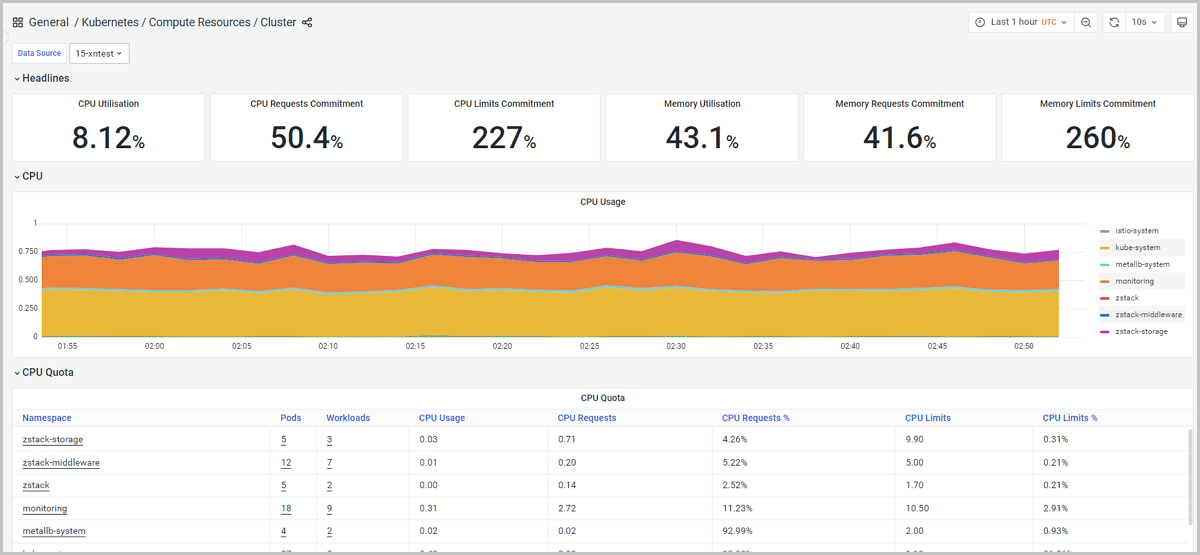 进入Kubernetes / Compute Resources / Cluster监控面板,可查看Kubernetes集群CPU使用率、内存使用率,以及各个命名空间的CPU和内存使用情况。