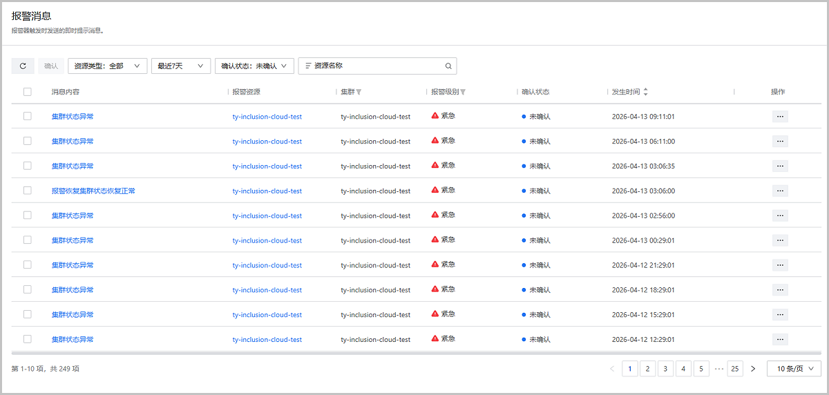 • 支持通过资源名称、资源类型、确认状态搜索报警消息,默认展示7天内,全部资源的未确认报警消息。